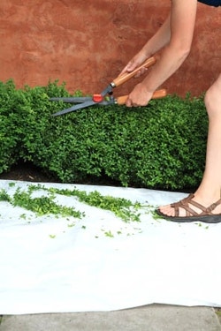 Foto: Fangen Sie Buchs Schnittgut auf, indem Sie ein Tuch oder eine Plane neben die Hecke legen