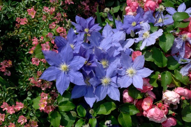 Großblumige Waldreben, die bis in den Spätsommer blühen