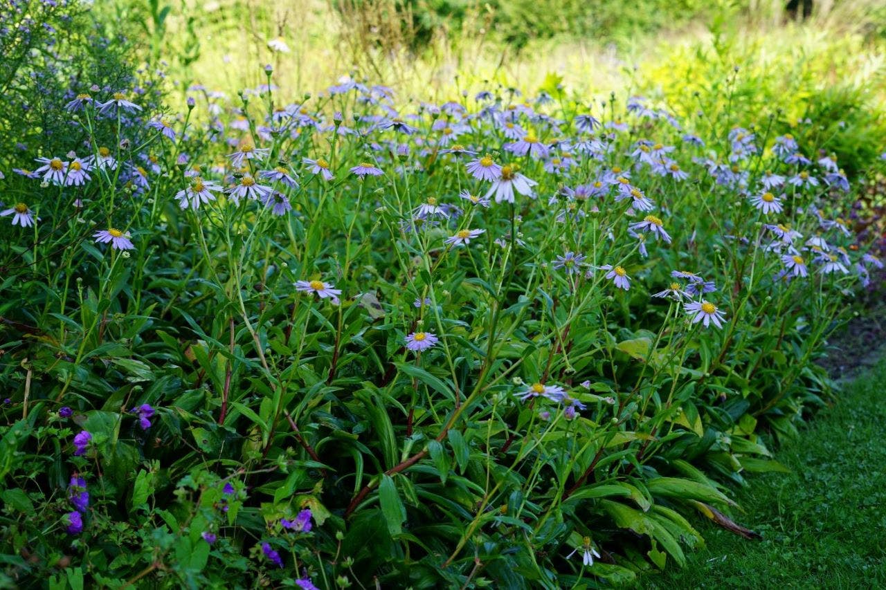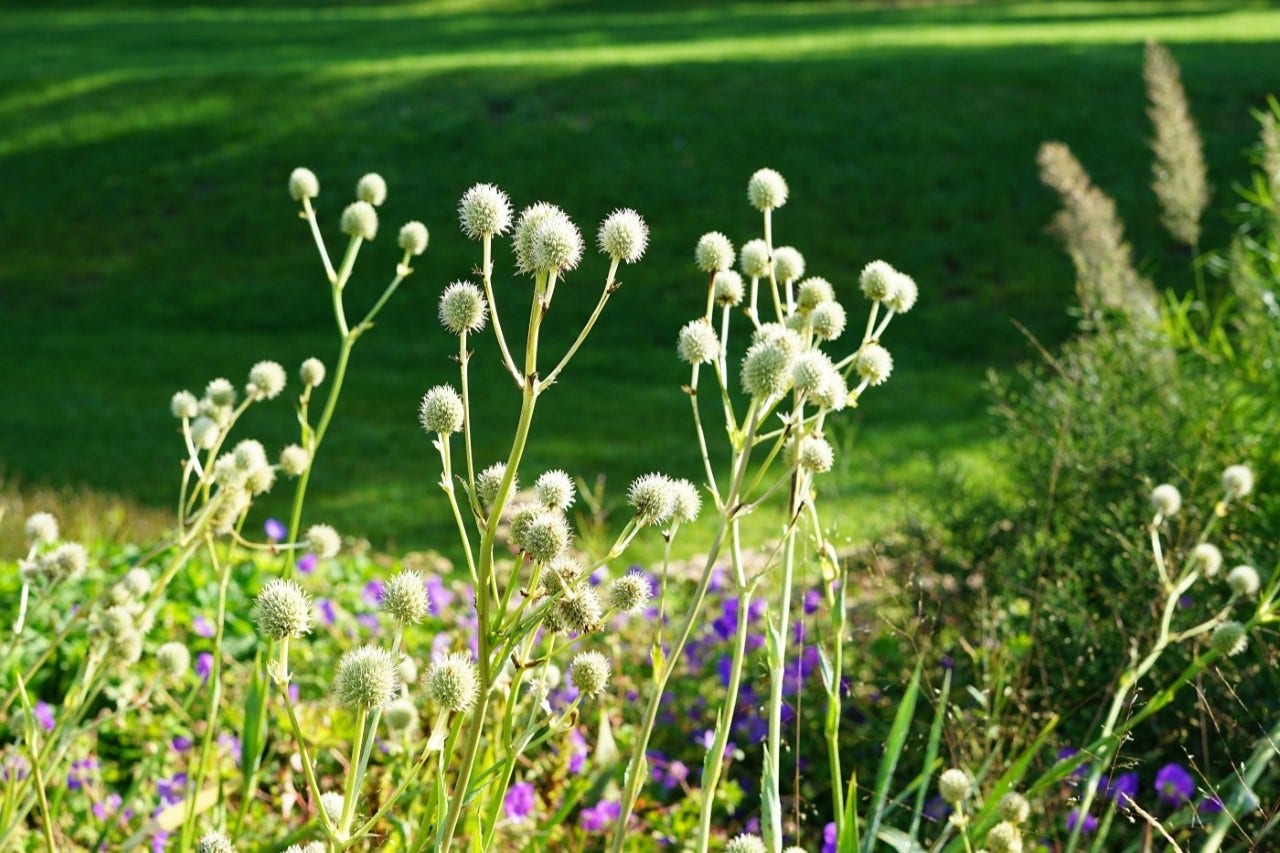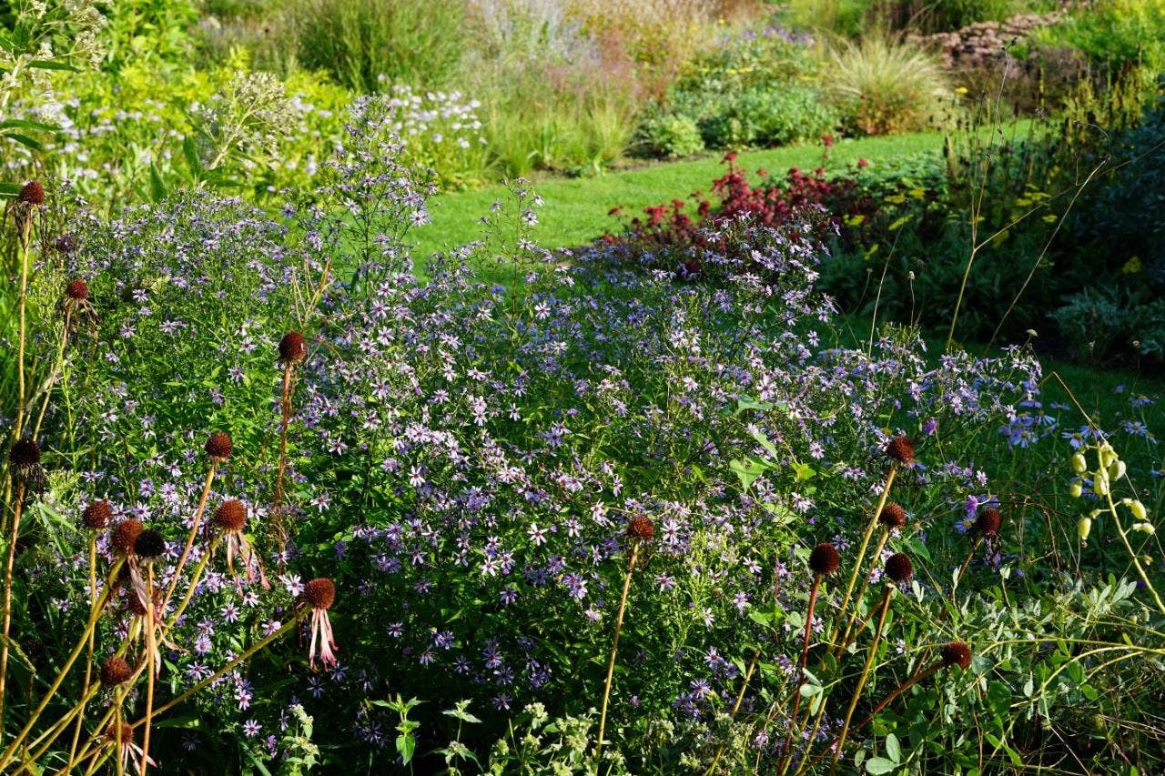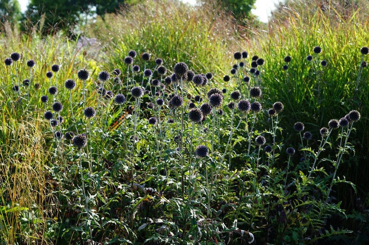 Pflanzen, die jetzt noch in voller Blüte stehen, sind zum Beispiel Aster, Knöterich, Rote Sonnenhut und Kugeldistel. Bei letzterer sieht man aber schon deutlich, dass die Blüte ihren Höhepunkt überschritten hat. Auch die blühenden Ziergräser sind wunderschön anzusehen.
