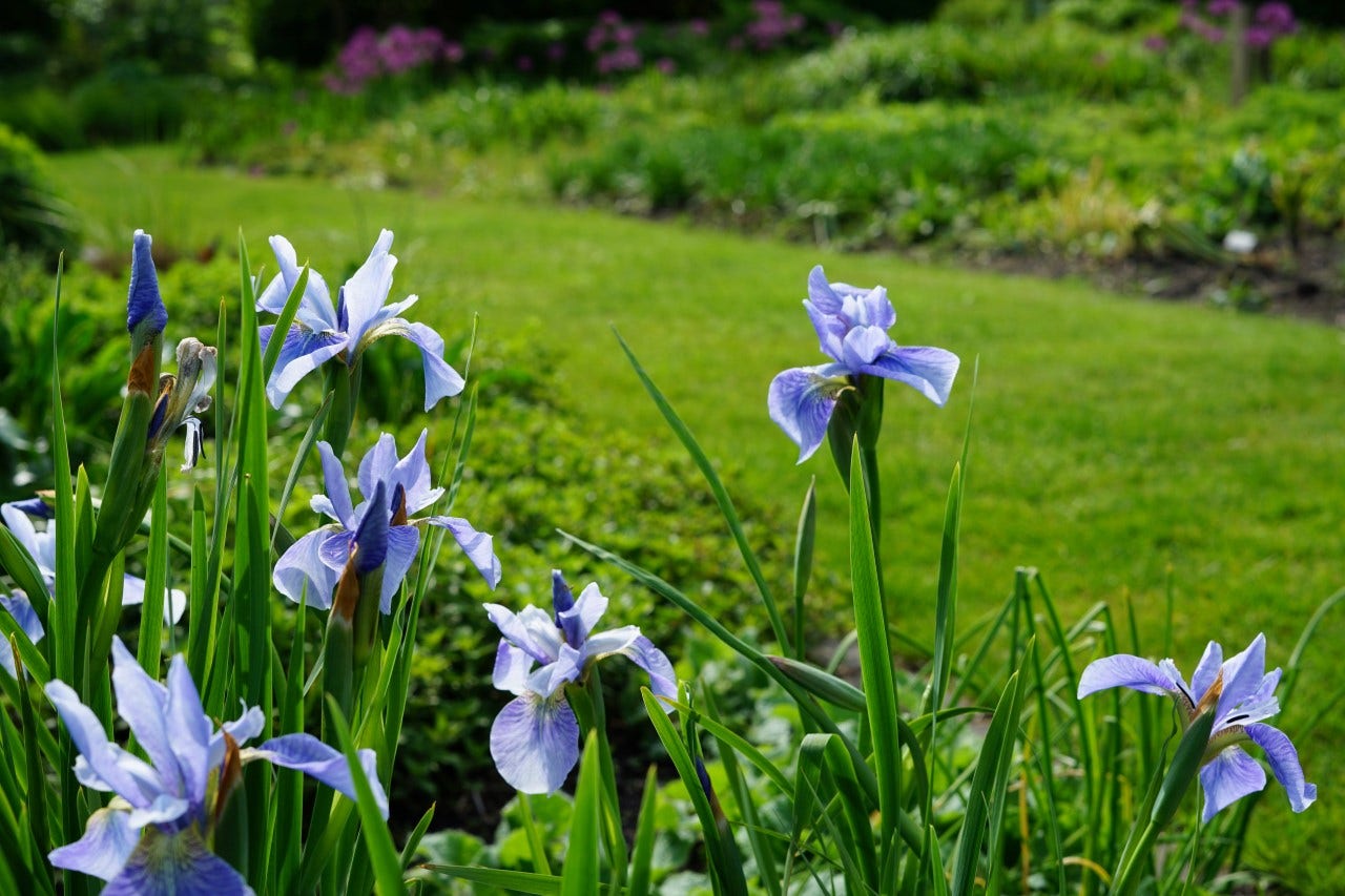 Während unseres Besuchs sahen wir bereits viel Farbe in den Beeten. Natürlich gibt es die Blüte der Zierlauch (Allium), die mit ihren Stielen über den Stauden ragen. Stern-Immergrün (Amsonia) sorgt für Farbe, mit den vielen hellblauen Blüten und dem leuchtend grünen Laub. Die ebenfalls hellblauen Blüten von Iris sibirica beeindrucken ebenfalls, besonders schön in Kombination mit Allium. Davon sind einige schöne große Gruppen vorhanden. Das Japanische Berggras (Hakonechloa macra) hat an verschiedenen Stellen im Garten eine beeindruckende Größe erreicht und verleiht den Beeten viel Struktur. Zusammen mit Geranium, Persicaria und Heuchera verleihen sie dem Garten eine frische grüne Ausstrahlung. Zwischen all dem Grün und den Pflanzen, die jetzt schon blühen, bildet das rote Laub von Penstemon Husker Red einen schönen Kontrast. An schattigeren Stellen wachsen große Salomonssiegel (Polygonatum). Verschiedene mehrstämmige Bäume, darunter der Sieben Söhne Baum, sorgen für zusätzliche Struktur im Garten.