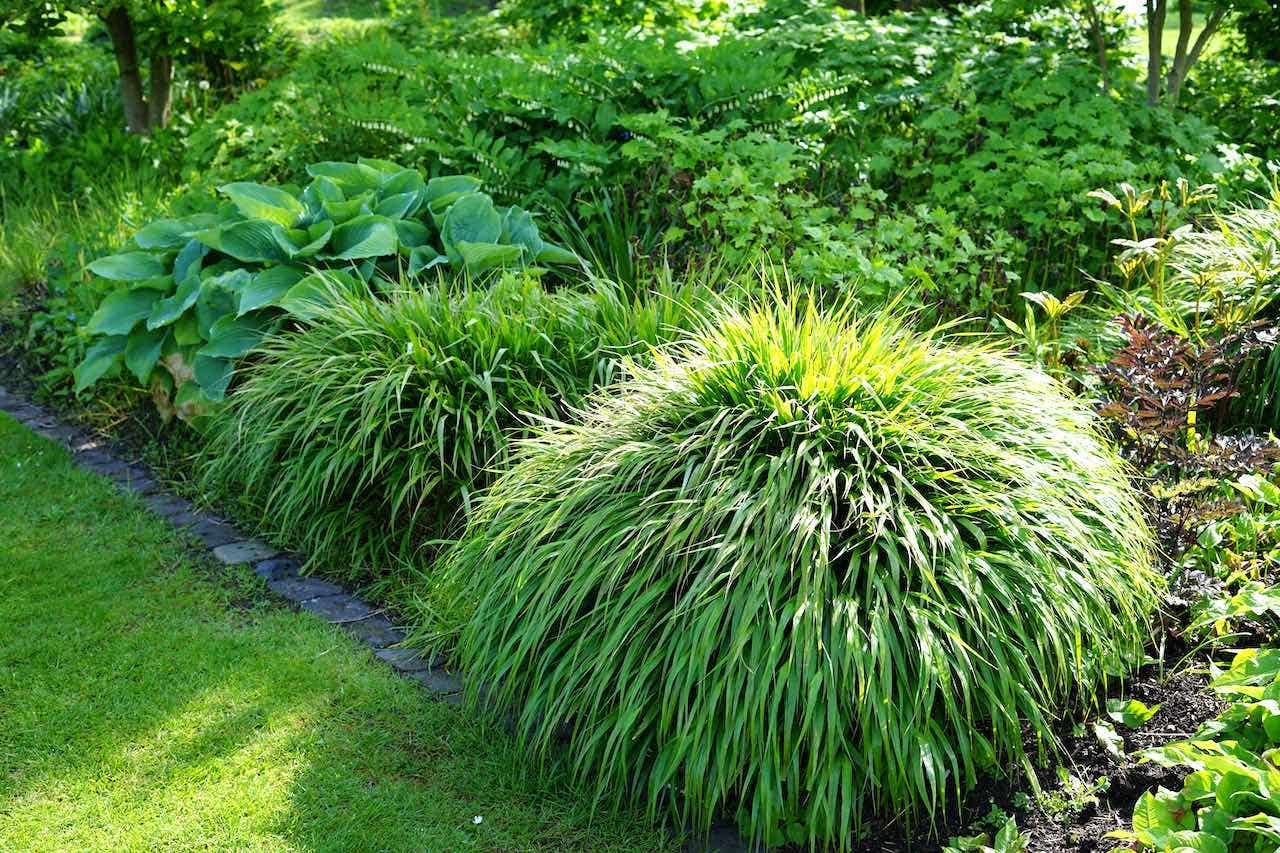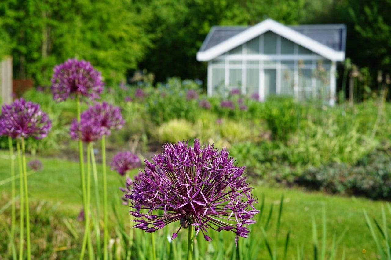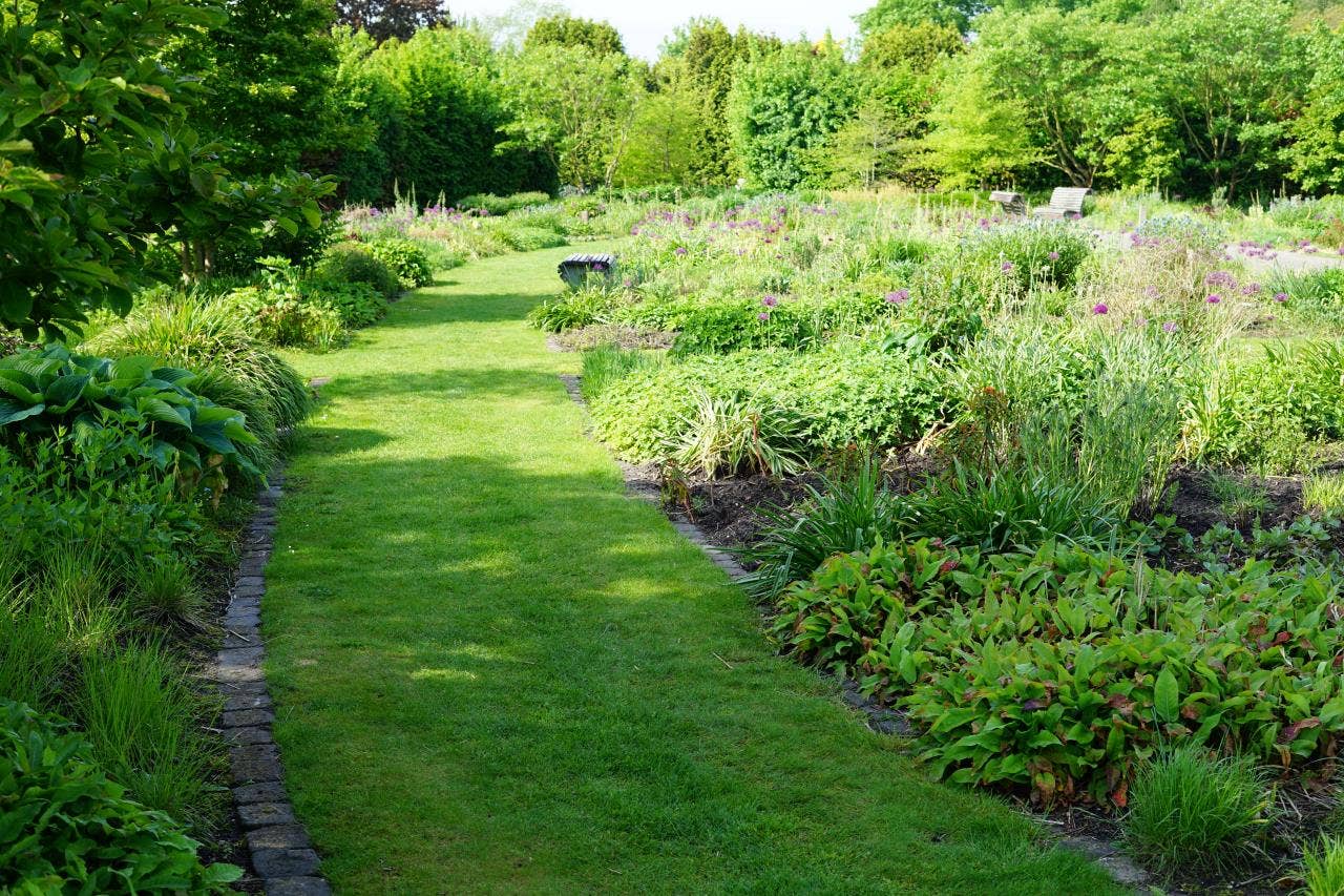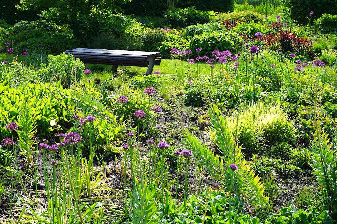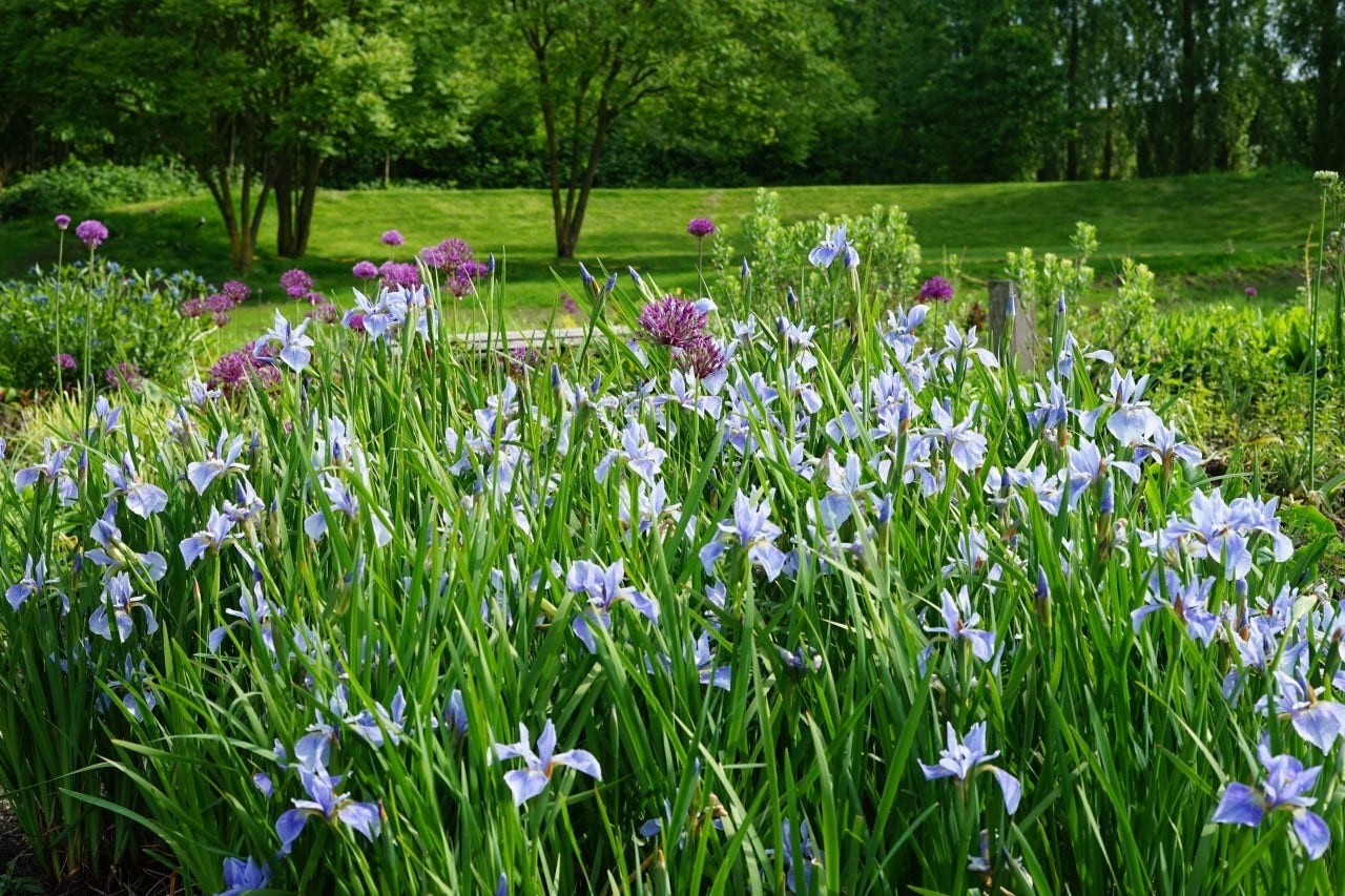 Während unseres Besuchs sahen wir bereits viel Farbe in den Beeten. Natürlich gibt es die Blüte der Zierlauch (Allium), die mit ihren Stielen über den Stauden ragen. Stern-Immergrün (Amsonia) sorgt für Farbe, mit den vielen hellblauen Blüten und dem leuchtend grünen Laub. Die ebenfalls hellblauen Blüten von Iris sibirica beeindrucken ebenfalls, besonders schön in Kombination mit Allium. Davon sind einige schöne große Gruppen vorhanden. Das Japanische Berggras (Hakonechloa macra) hat an verschiedenen Stellen im Garten eine beeindruckende Größe erreicht und verleiht den Beeten viel Struktur. Zusammen mit Geranium, Persicaria und Heuchera verleihen sie dem Garten eine frische grüne Ausstrahlung. Zwischen all dem Grün und den Pflanzen, die jetzt schon blühen, bildet das rote Laub von Penstemon Husker Red einen schönen Kontrast. An schattigeren Stellen wachsen große Salomonssiegel (Polygonatum). Verschiedene mehrstämmige Bäume, darunter der Sieben Söhne Baum, sorgen für zusätzliche Struktur im Garten.