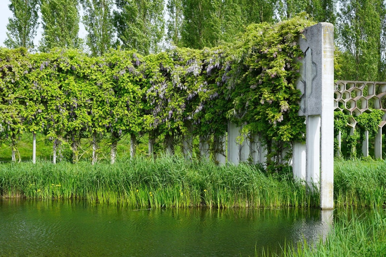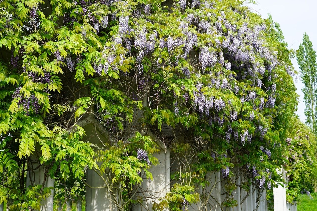 Diese mit Wisteria bewachsene Betonpergola ist Teil der Parkpergola und ist ca. 1 Kilometer lang und 6 Meter hoch! An anderen Stellen wachsen Efeu, Wilder Wein und Hopfen über diese Pergola.
